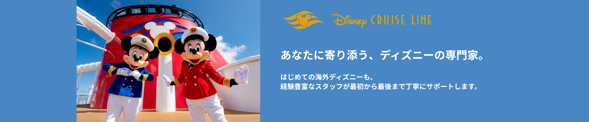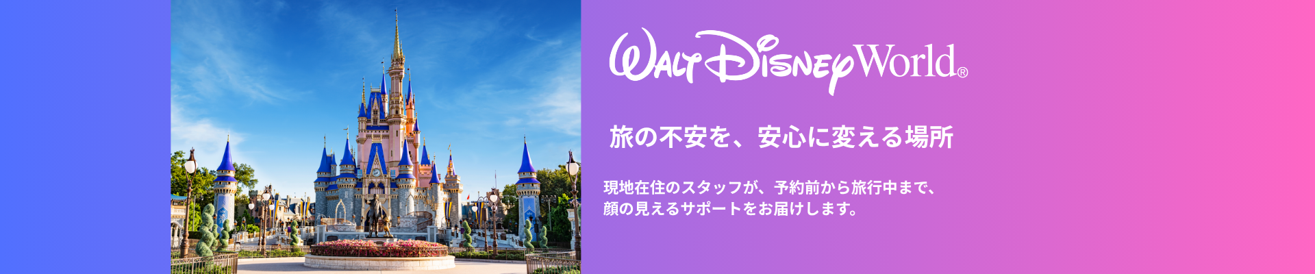 私たちは、アメリカ・ディズニーリゾート旅行を専門にサポートする米国ディズニー公認旅行会社です。現地の最新情報と豊富な専門知識をもとに、チケットやホテル予約、スケジュールの提案、現地でのサポートまで、あなたの旅をトータルでサポートします。