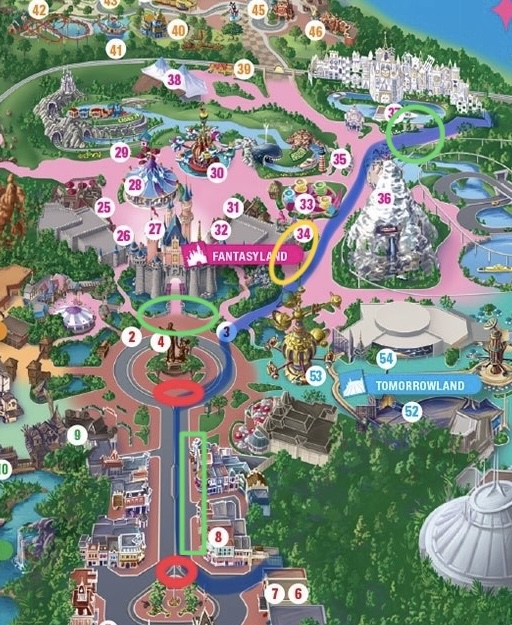 A Christmas Fantasy Paradeのおすすめ鑑賞スポットです。ショーやパレードの中でも、特に見やすく写真が撮りやすい位置を示しています。