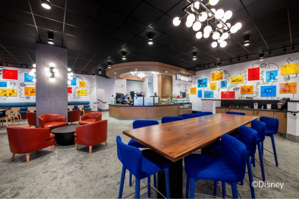 ロビー階にあるテイクアウト専門のカフェ。コーヒー、ペストリー、クロワッサン、サンドイッチなど、パークへ向かう前の“さっと食べたい朝食”に便利です。ピクサーアートをモチーフにした店内ディスプレイも見どころ。